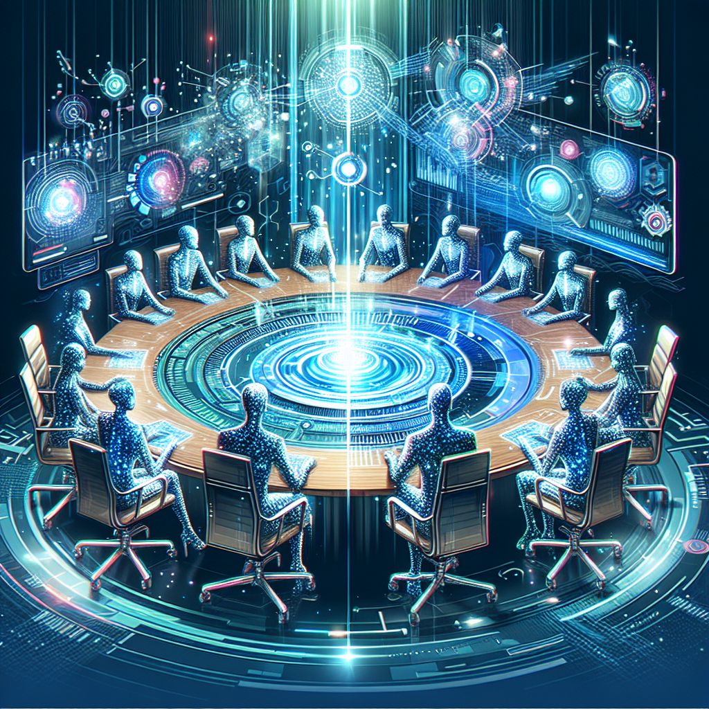 Alt Text Image: Illustration of multiple AI agents collaborating around a digital roundtable